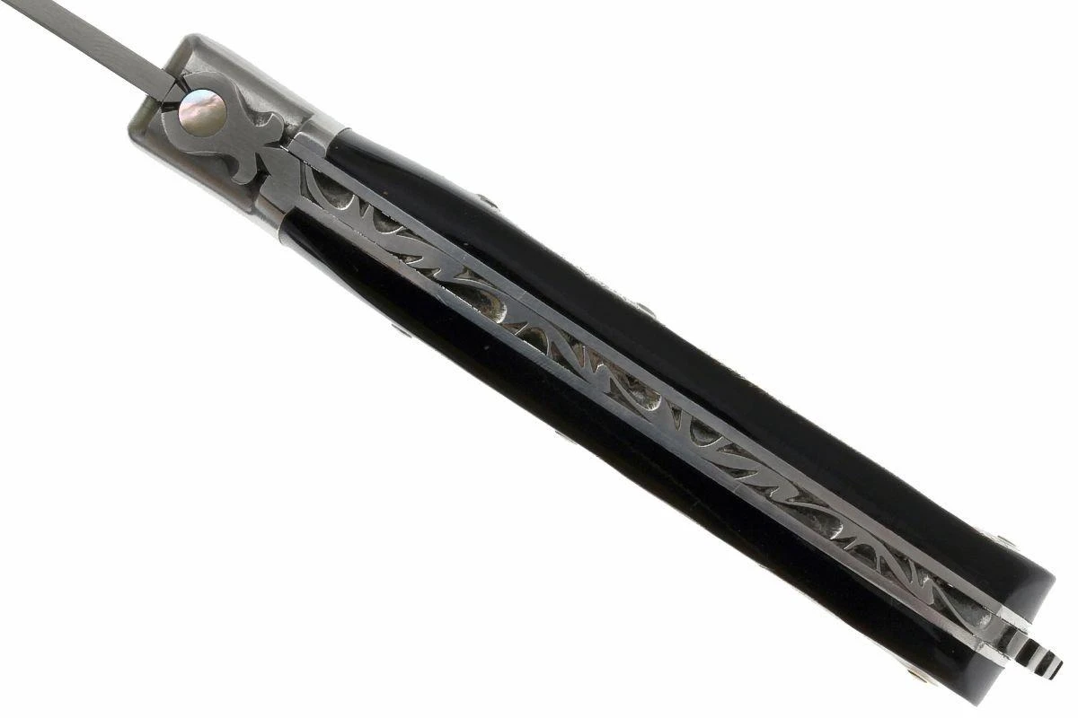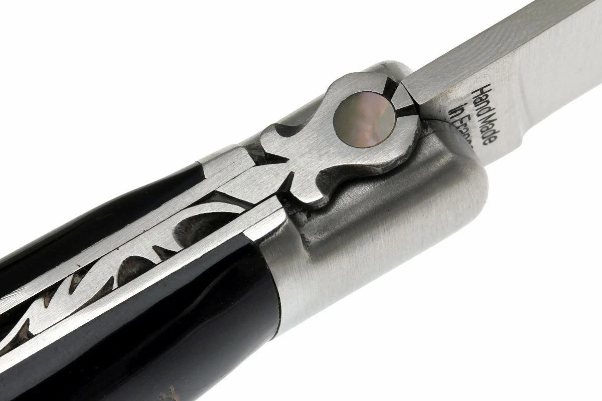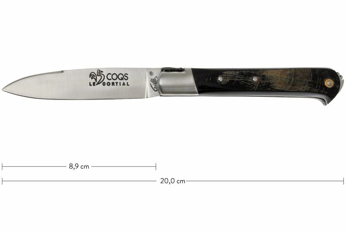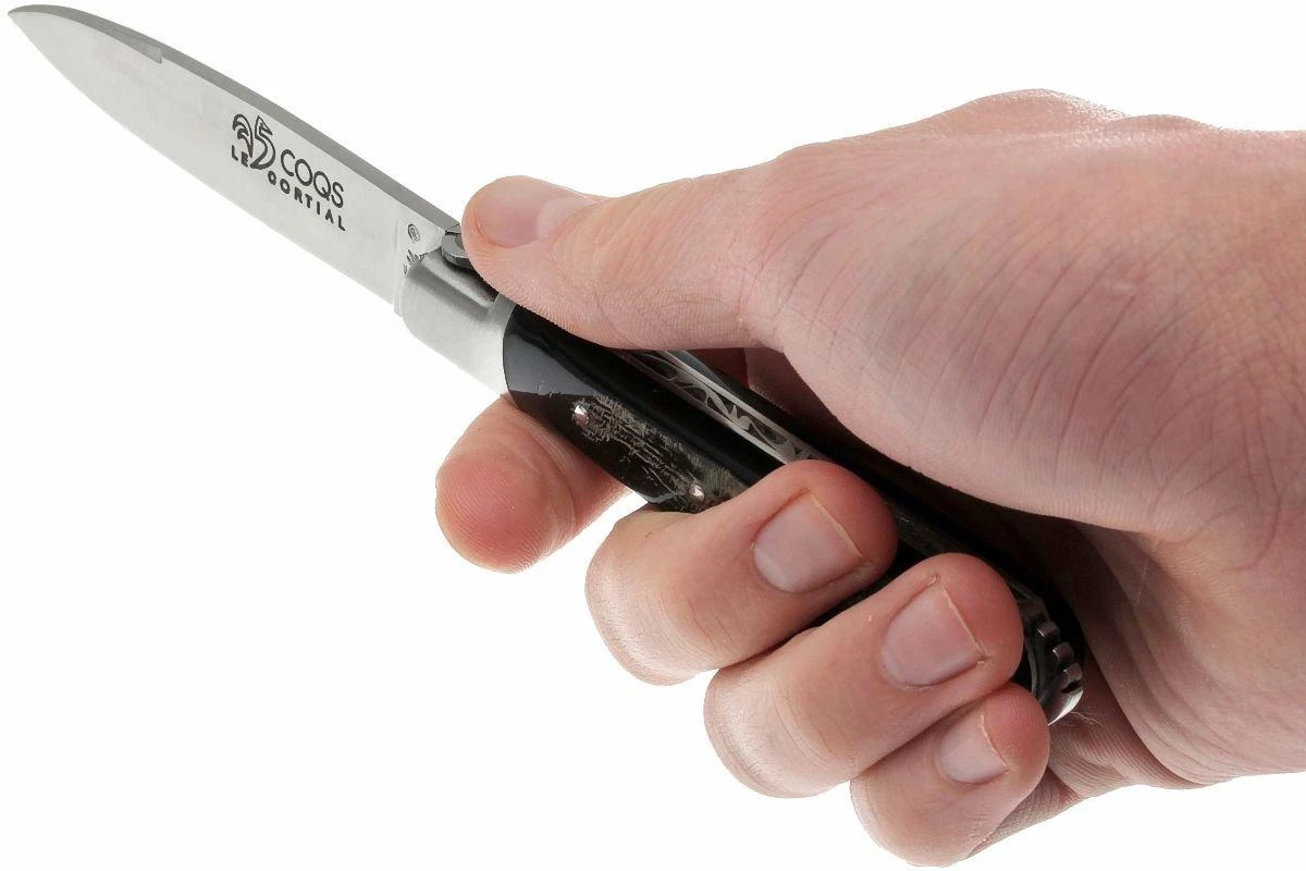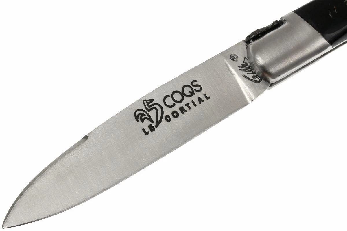 La sĂ©rie ‘5 Coqs’ de Fontenille Pataud doit son nom Ă la petite ville d’Yssingeaux en France. En patois auvergnat, « i-sin-jo » signifie « cinq jeunes coqs ». On retrouve Ă©galement un coq stylisĂ© sur la lame, dans lequel on perçoit un « 5 ». Et le bas du manche ressemble Ă une crĂŞte de coq. Les yeux du coq se dĂ©clinent en deux couleurs. Du nacre a Ă©tĂ© utilisĂ© dans la forme qui remplace l’abeille et qui ressemble beaucoup Ă une croix Ă©gyptienne.